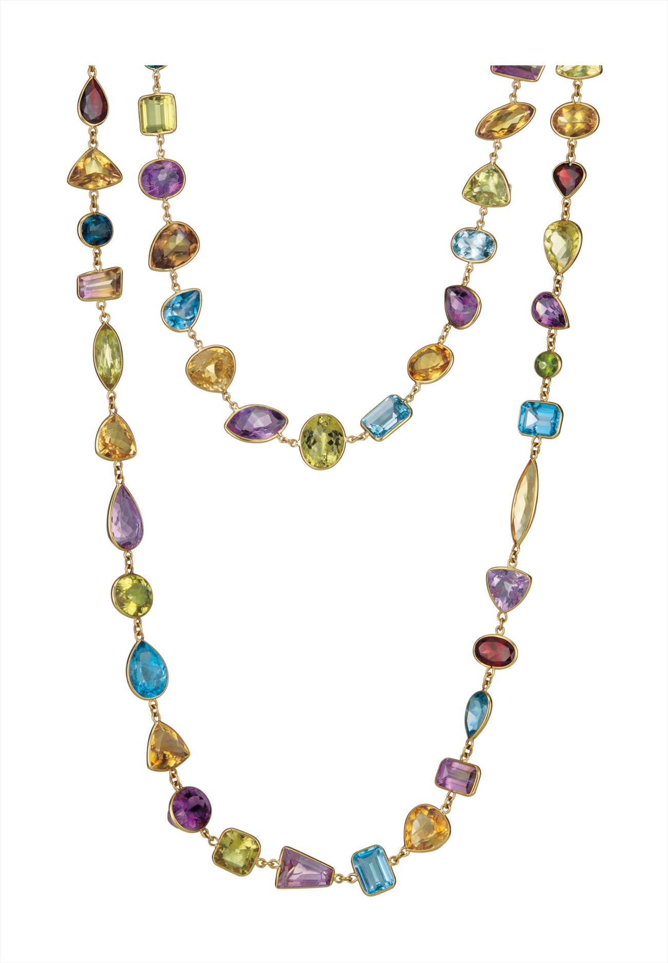 Comprising two necklaces, each set with vari-cut spectacle-set citrine, amethyst, blue topaz, garnet, and peridot, mounted in 18K yellow gold, length 18 inches and 36 inches.