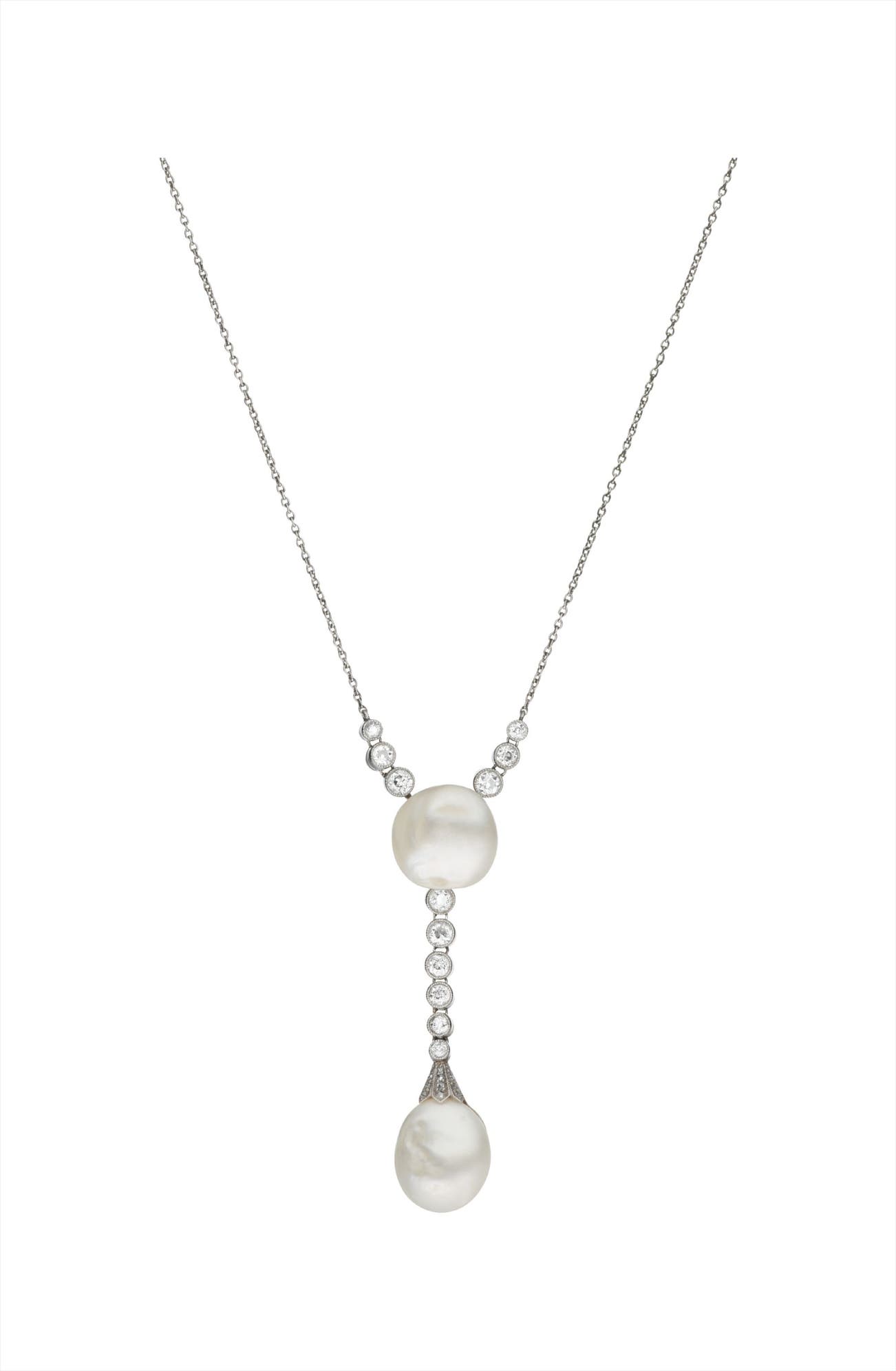 Designed as a collet-set diamond 'Y' shaped drop, accented by two natural saltwater pearls, measuring approximately 13.57 x 13.35 and 12.39 mm, to the fine link chain, mounted in platinum, length 17 1/2 inches.