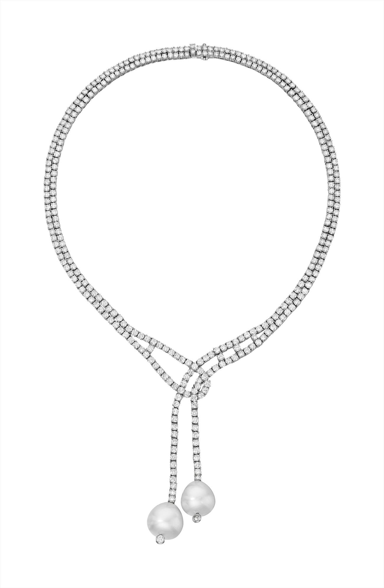 Designed as two rows of circular-cut diamonds, suspending circular-cut diamond fringes set with cultured pearl terminals, mounted in 18K white gold, length 22 inches.