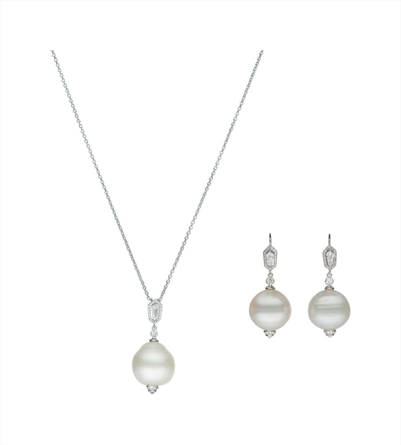 Comprising a necklace suspending a cultured pearl, measuring approximately 17.40 mm, enhanced by circular-cut diamond accents, surmounted by a kite-shaped diamond within a pavé-set diamond surround; a pair of ear pendants en suite, mounted in 18K white gold and sterling silver, chain length 17 inches, pendant length 1 1/2 inches, ear pendant length 1 3/4 inches.