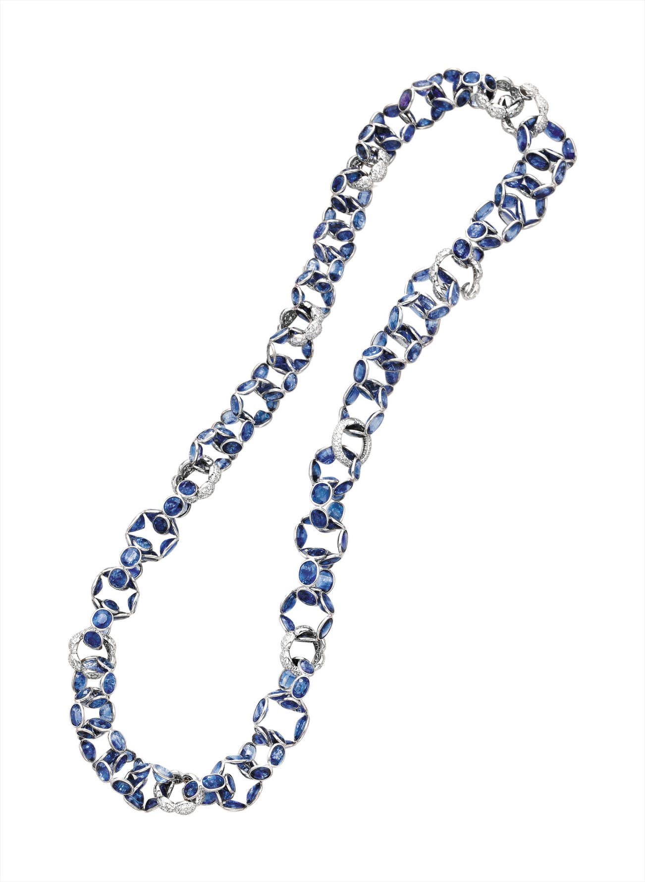 Designed as a series of interlocking oval-cut sapphire hoop links, interspersed by pavé-set diamond links, mounted in 18K white gold, length 22 inches.