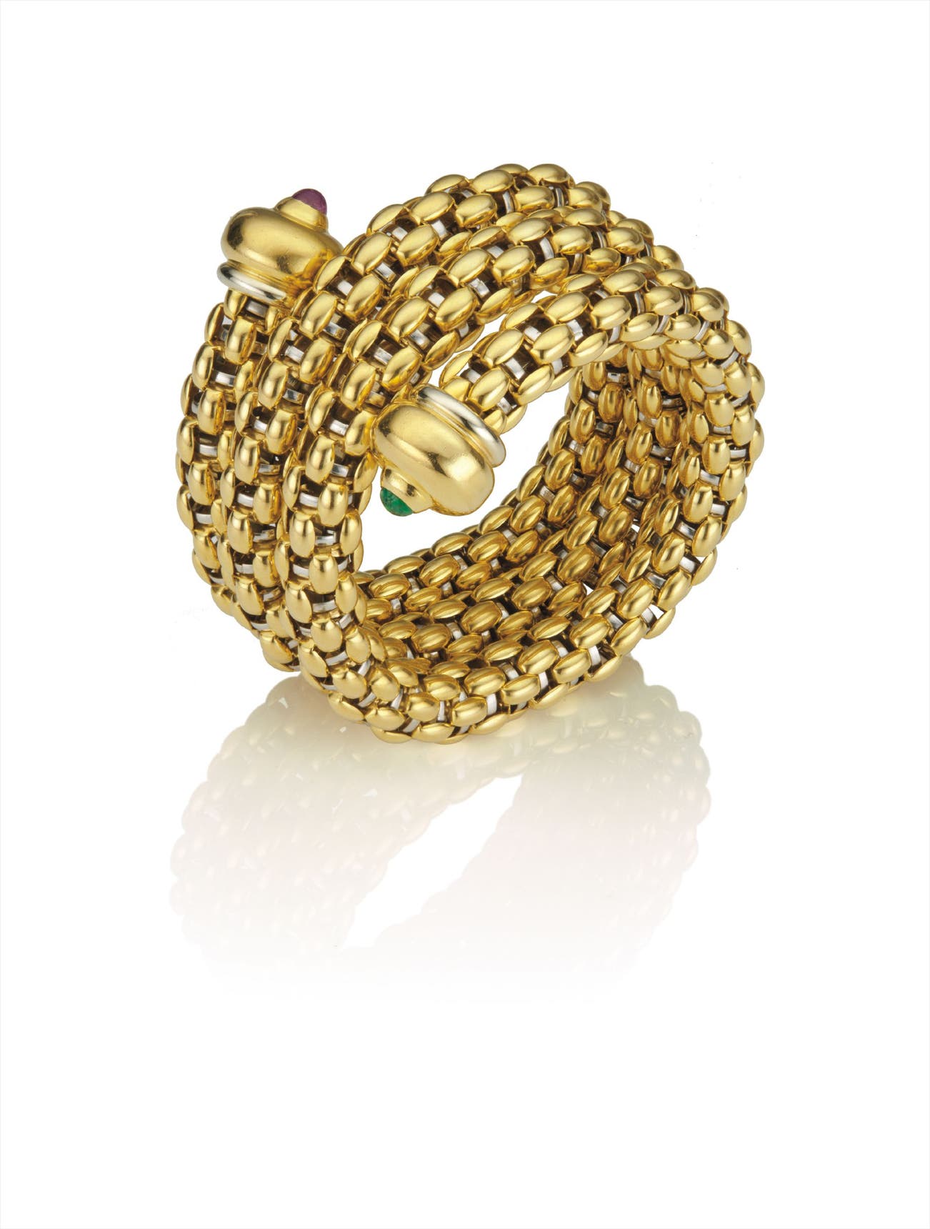 Designed as a flexible coil bracelet of interlocking polished gold links, the terminals set with a cabochon emerald or ruby, mounted in 18K yellow gold, diameter 2 inches.