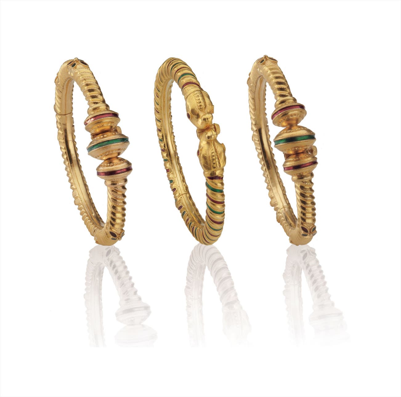 A set of three hinged bangle bracelets of gold rope-twist design decorated with red and green enamel, one enhanced by elephant head terminals, two enhanced by circular bombé terminals and florets motifs, mounted in 22K gold, diameter 2 1/4 inches.