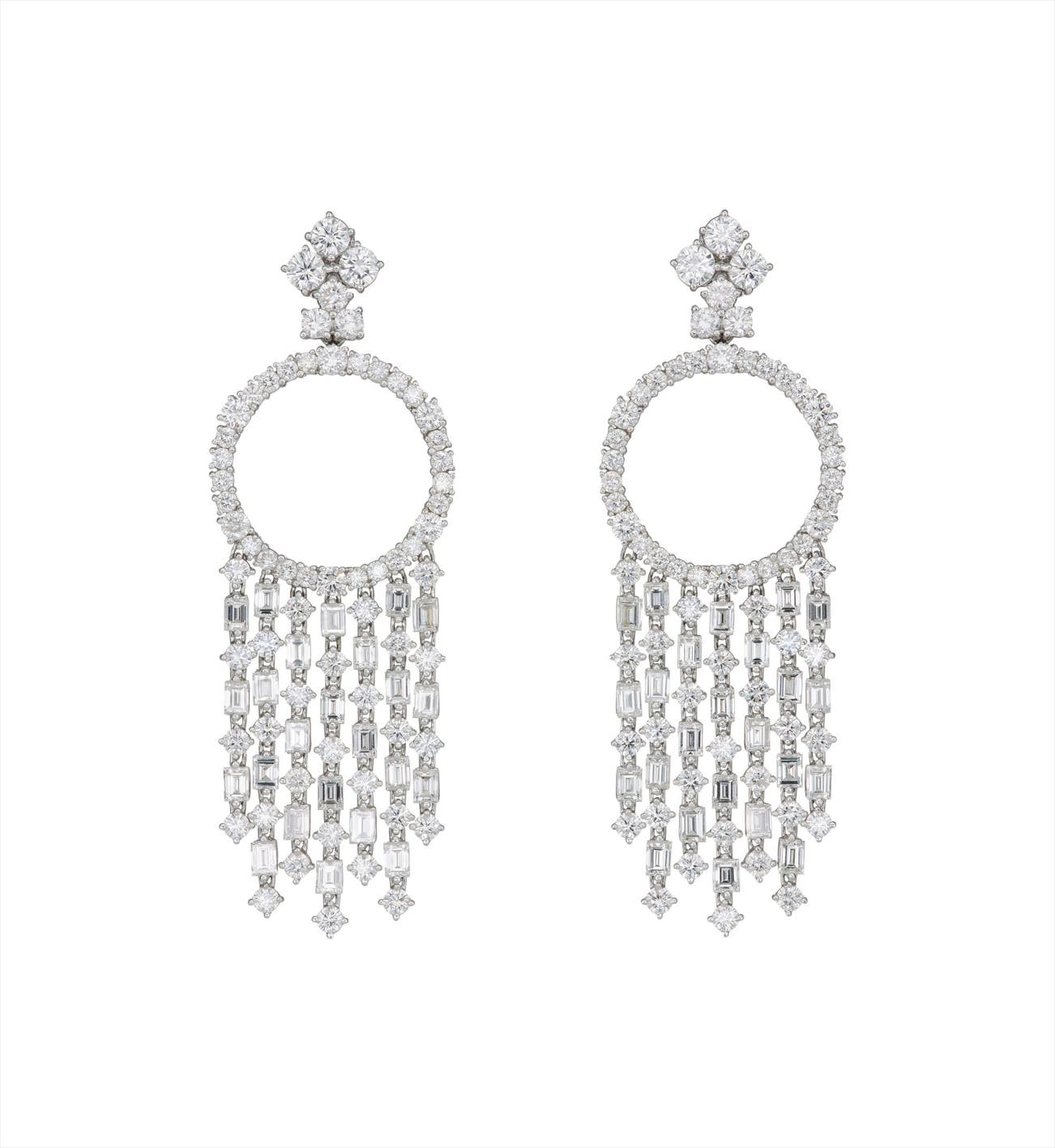 Each designed as a circular-cut diamond cluster surmount, suspending a circular-cut diamond swing hoop, enhanced by baguette and circular-cut diamond fringes, mounted in 18K white gold, length 2 3/4 inches.