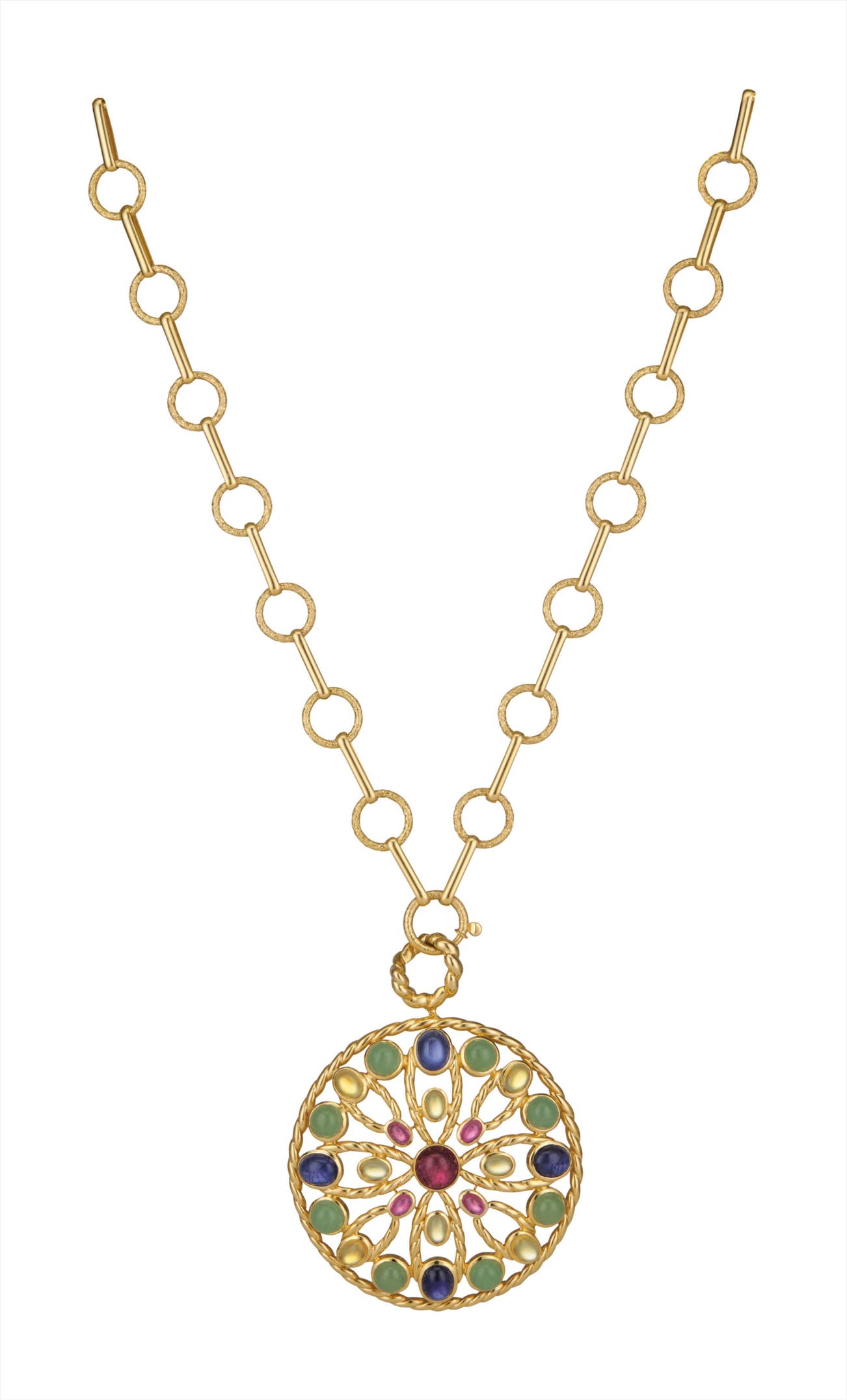 Set to the front with an open-work medallion pendant, of gold rope-twist design, set with cabochon citrine, pink tourmaline, iolite, and serpentine, suspended from a polished gold fancy link chain, mounted in 18K yellow gold, chain length 33 inches, pendant length 3 1/2 inches.