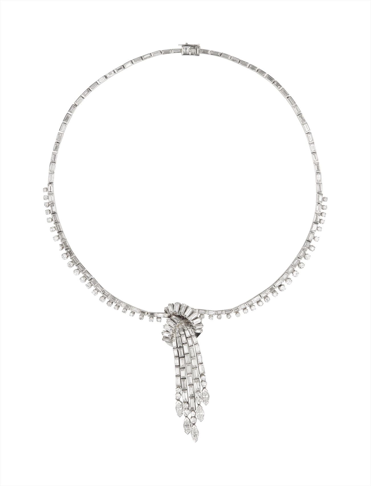 Designed as a line of graduated baguette-cut diamonds, enhanced by a circular-cut diamond border, set to the front with a stylized knot and cascade of baguette-cut diamond fringe with circular and marquise-cut terminals, mounted in platinum, length 16 inches, drop length 2 1/4 inches.