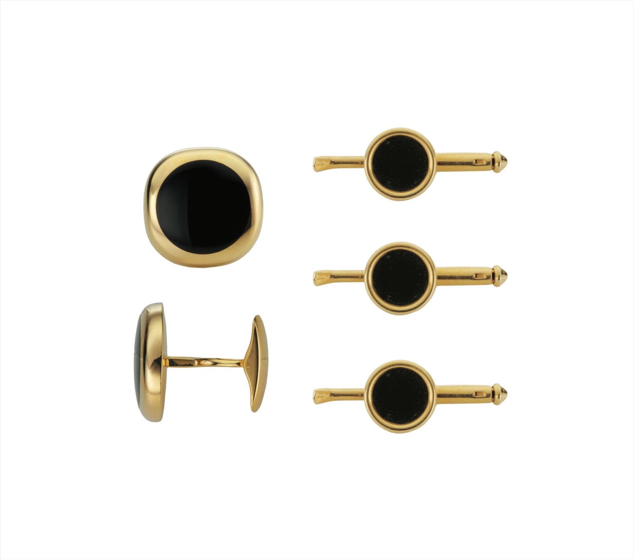 Comprising a pair of cufflinks, designed as a round polished gold plaque, centrally enhanced by a circular onyx inlay, to the gold swivel link; three shirt studs en suite, mounted in 14K and 18K yellow gold, cufflink length 3/4 inch, shirt stud length 3/8 inch.