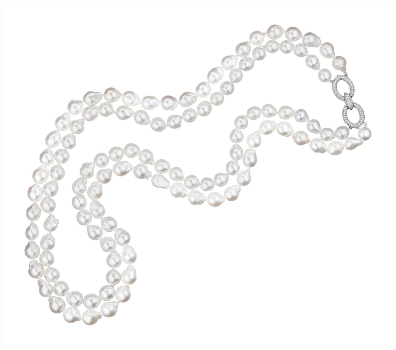 Designed as two graduated strands of one-hundred and sixteen baroque cultured pearls, measuring from approximately 13.50 to 11.00 mm, joined by a pavé-set diamond clasp, mounted in 18K white gold, length 33 to 36 inches.