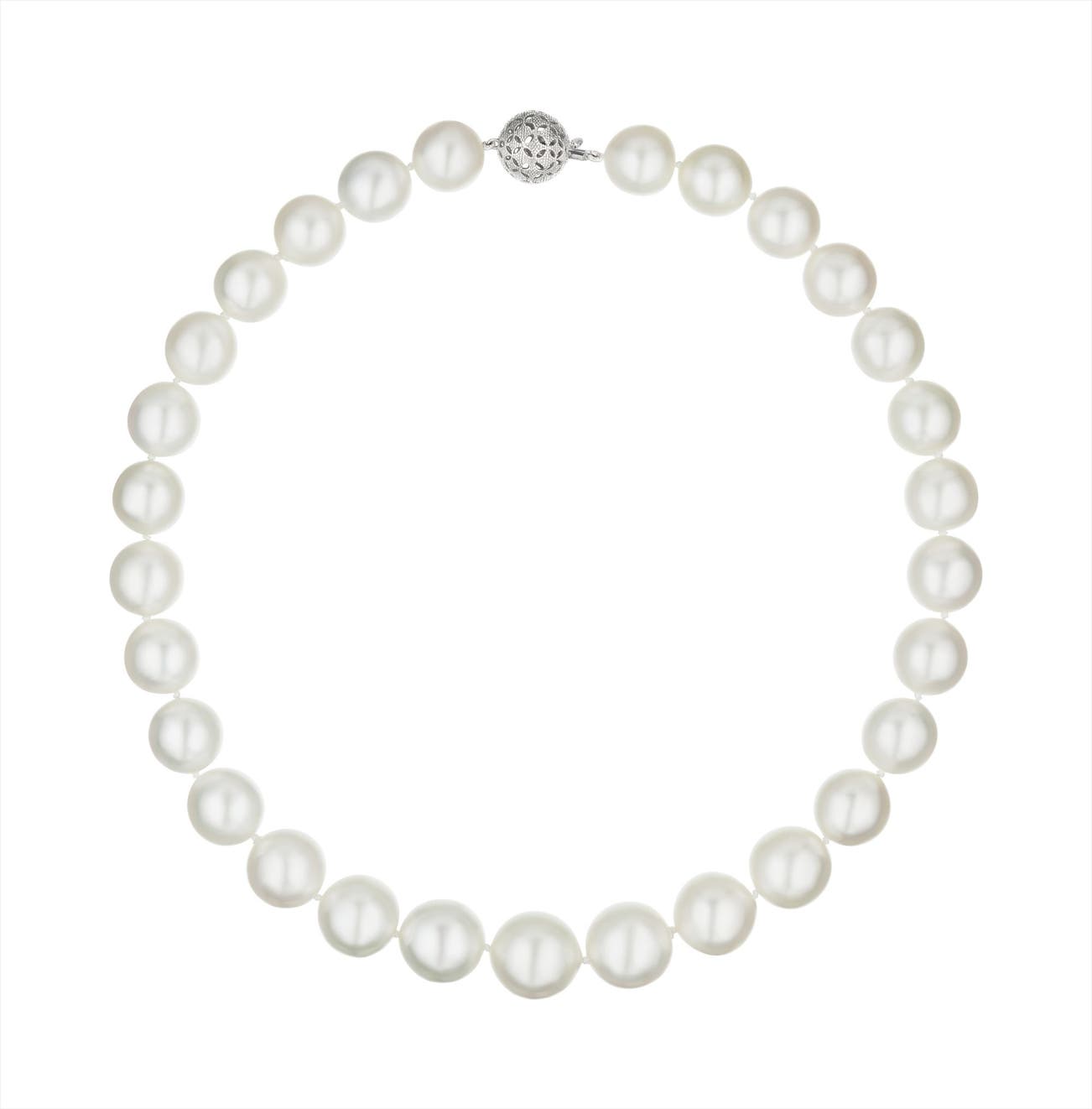 Of twenty-nine graduated South Sea cultured pearls, measuring from approximately 16.10 to 13.00 mm, joined by an open-work clasp, mounted in 18K white gold, length 18 inches.