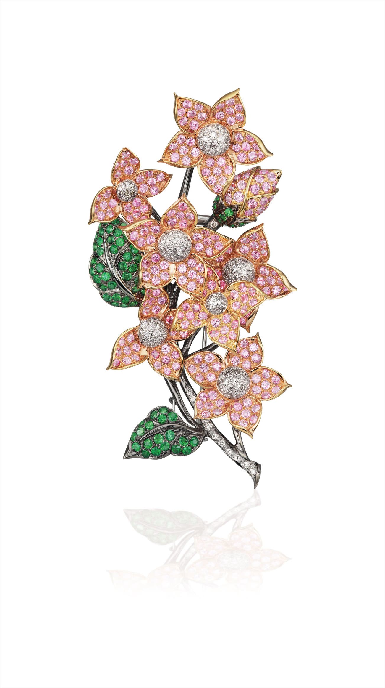 Designed as a floral spray, each articulated bloom set with circular-cut pink sapphires, centering upon a pavé-set diamond pistil, to the leaves and stem set with circular-cut tsavorite garnets and diamonds, mounted in 18K rose and blackened gold, length 3 1/2 inches.