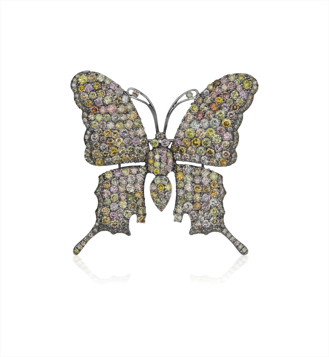 Designed as a butterfly entirely set with circular-cut diamonds and colored diamonds, mounted in 18K blackened gold, length 2 inches.