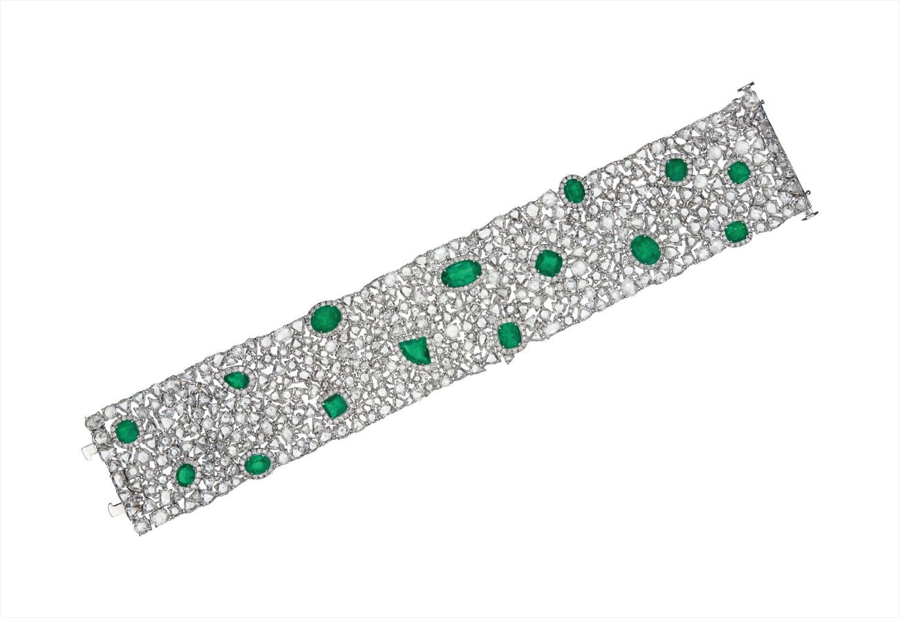 Of highly flexible design, the wide openwork band entirely set with circular and rose-cut diamonds weighing approximately 54.21 carats in total, and vari-cut emeralds, weighing approximately 13.23 carats in total, mounted in 18K white gold, length 7 1/4 inches.