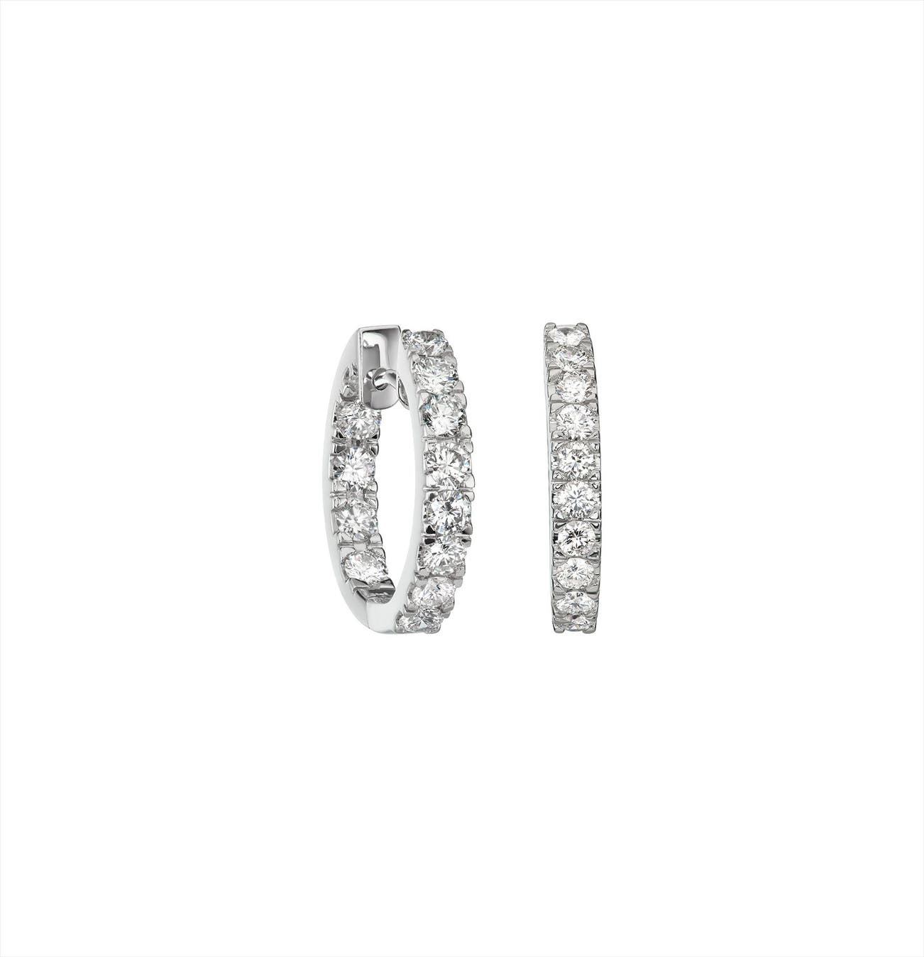 Each designed as a hoop, the front and interior back entirely set with circular-cut diamonds, mounted in 14K white gold, length 3/4 inch.