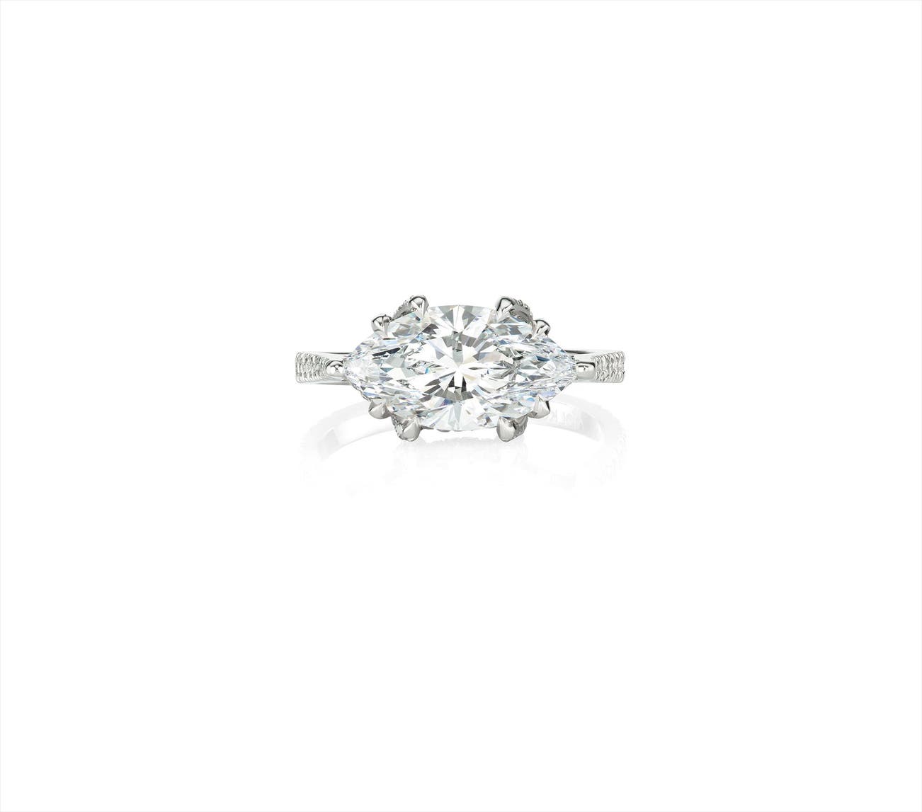 Centering upon a marquise-cut Type IIA diamond weighing approximately 4.01 carats, to the circular-cut diamond gallery and half-hoop, mounted in platinum, size 7.
