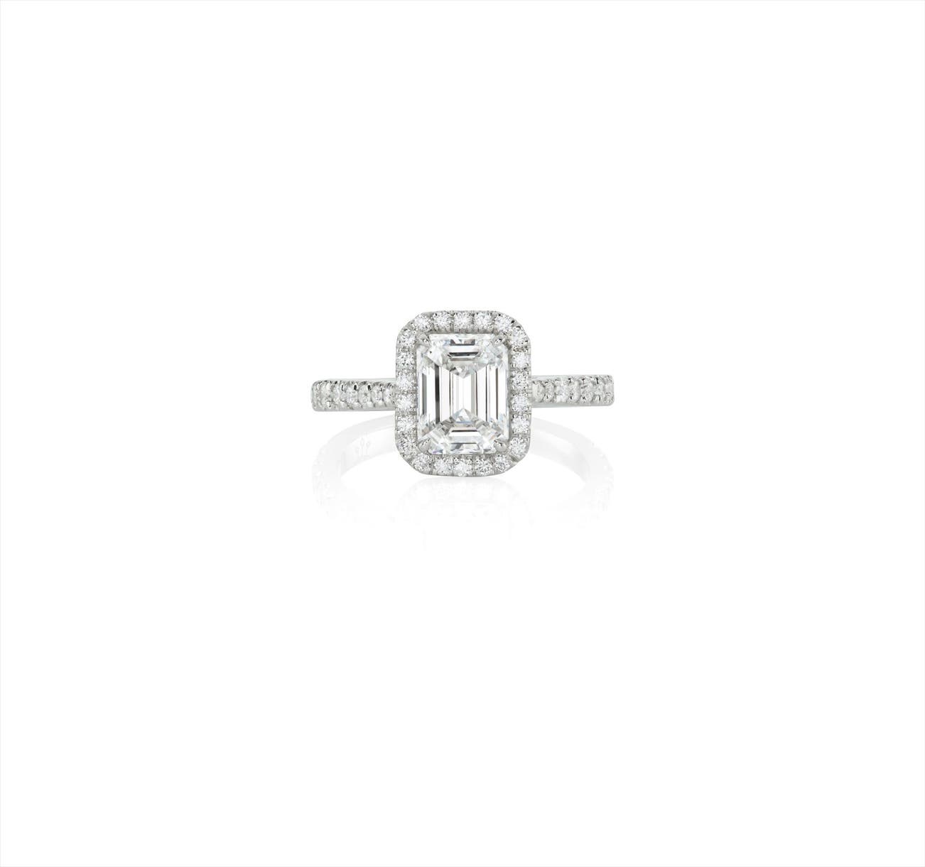 Centering upon a rectangular-cut diamond weighing approximately 1.66 carats, within a circular-cut diamond surround, to the pavé-set diamond shoulders, mounted in platinum, size 5 1/2.