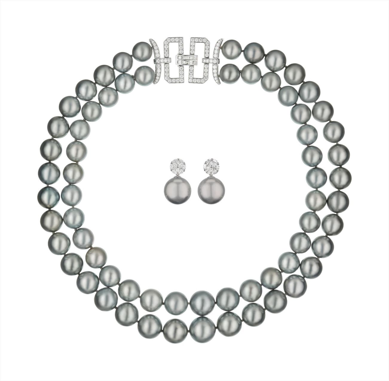 Designed as two graduated strands of Tahitian cultured pearls, measuring from approximately 14.60 to 11.00 mm, joined by a circular-cut diamond clasp; a pair of earclips en suite, mounted in 18K white gold, earclip length 1 inch, necklace length 16 3/4 to 18 3/4 inches.