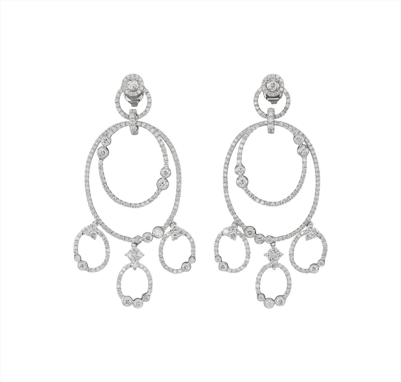 Each designed as a series of swing hoops entirely set with circular-cut diamonds, suspended from a similarly designed surmount, mounted in 18K white gold, length 2 1/2 inches.