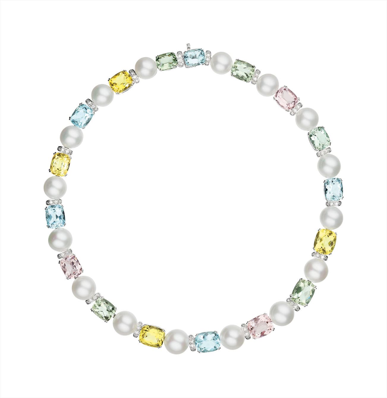 Designed as a line of cushion-cut aquamarine, morganite, green beryl and yellow beryl, weighing approximately 69.49 carats in total, interspersed by cultured pearls, measuring approximately 10.00-13.00 mm, and pavé-set diamond spacer links, mounted in 18K white gold, length 16 1/2 inches.