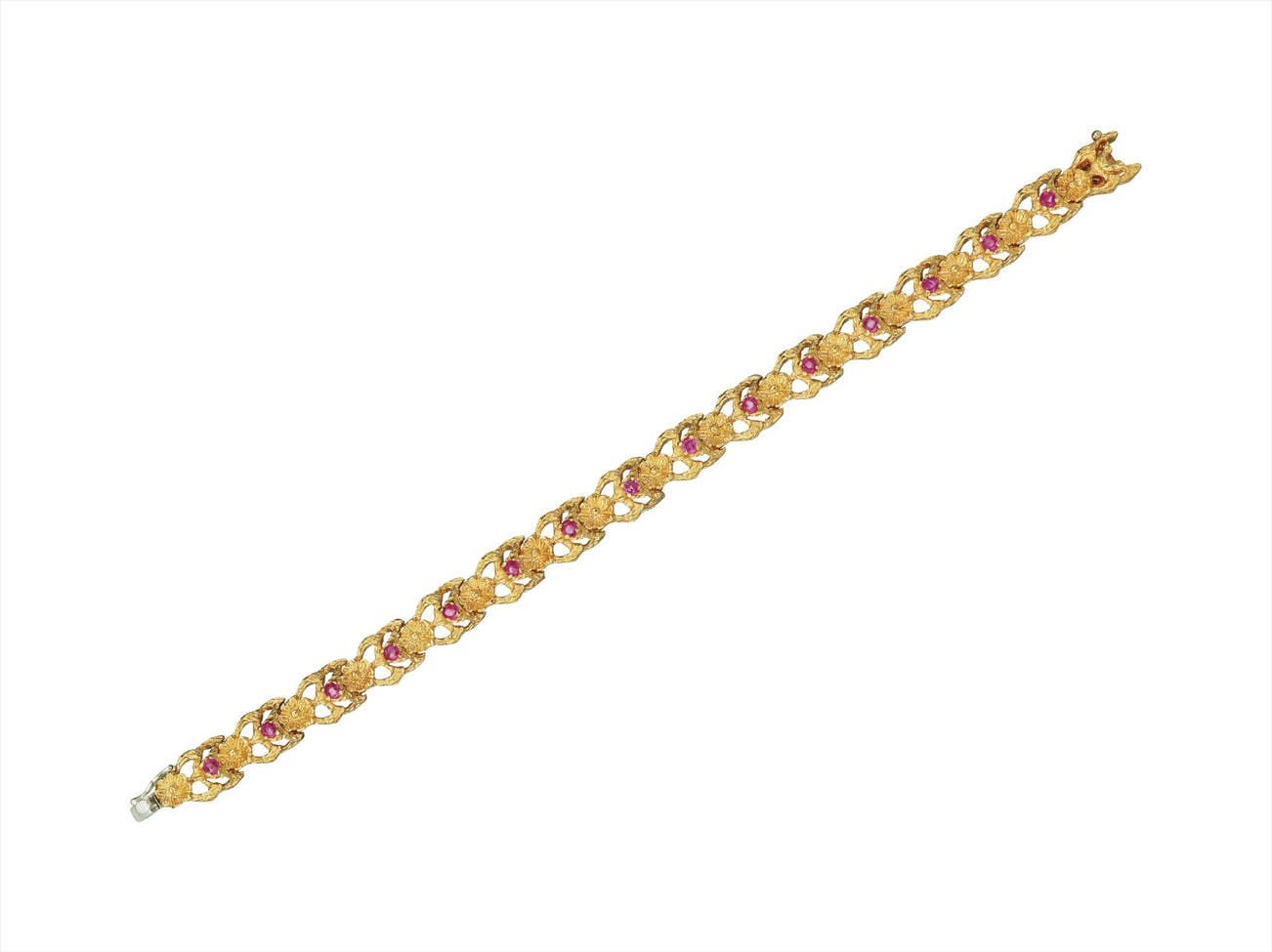Designed as a line of textured gold floral links set with circular-cut pink sapphires, mounted in 18K yellow gold, length 7 inches.