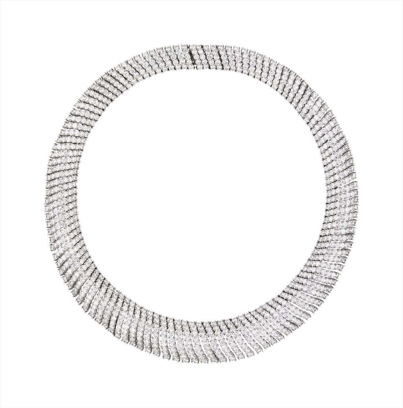 Of flexible design, the graduated band of linear links set with circular-cut diamonds extending to the concealed clasp, mounted in 18K white gold, length 15 inches.