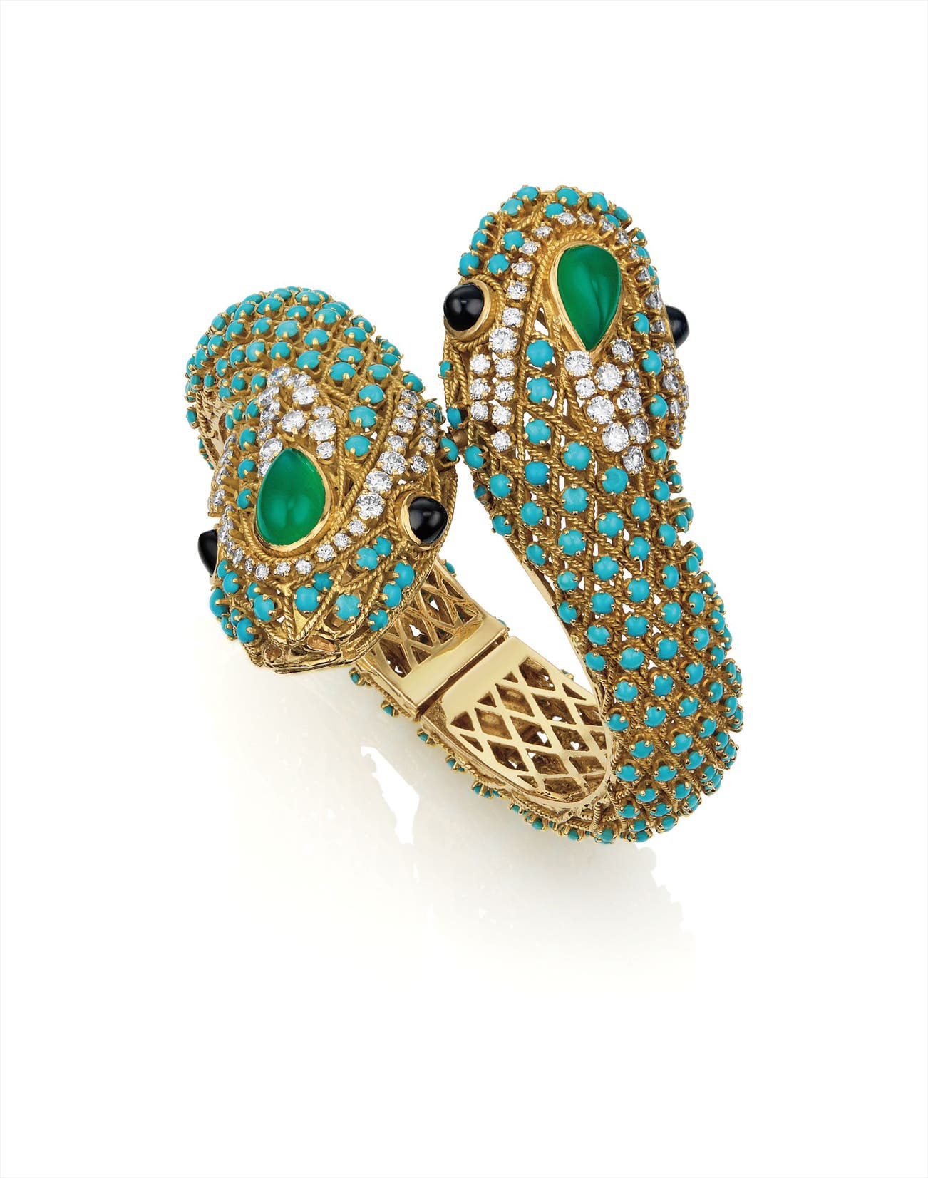 Designed as a crossover bangle, entirely set with cabochon turquoise, terminating with two snake heads, each accented by a cabochon emerald, circular-cut diamonds, and cabochon sapphire eyes, mounted in 18K yellow gold, diameter 2 3/8 inches.