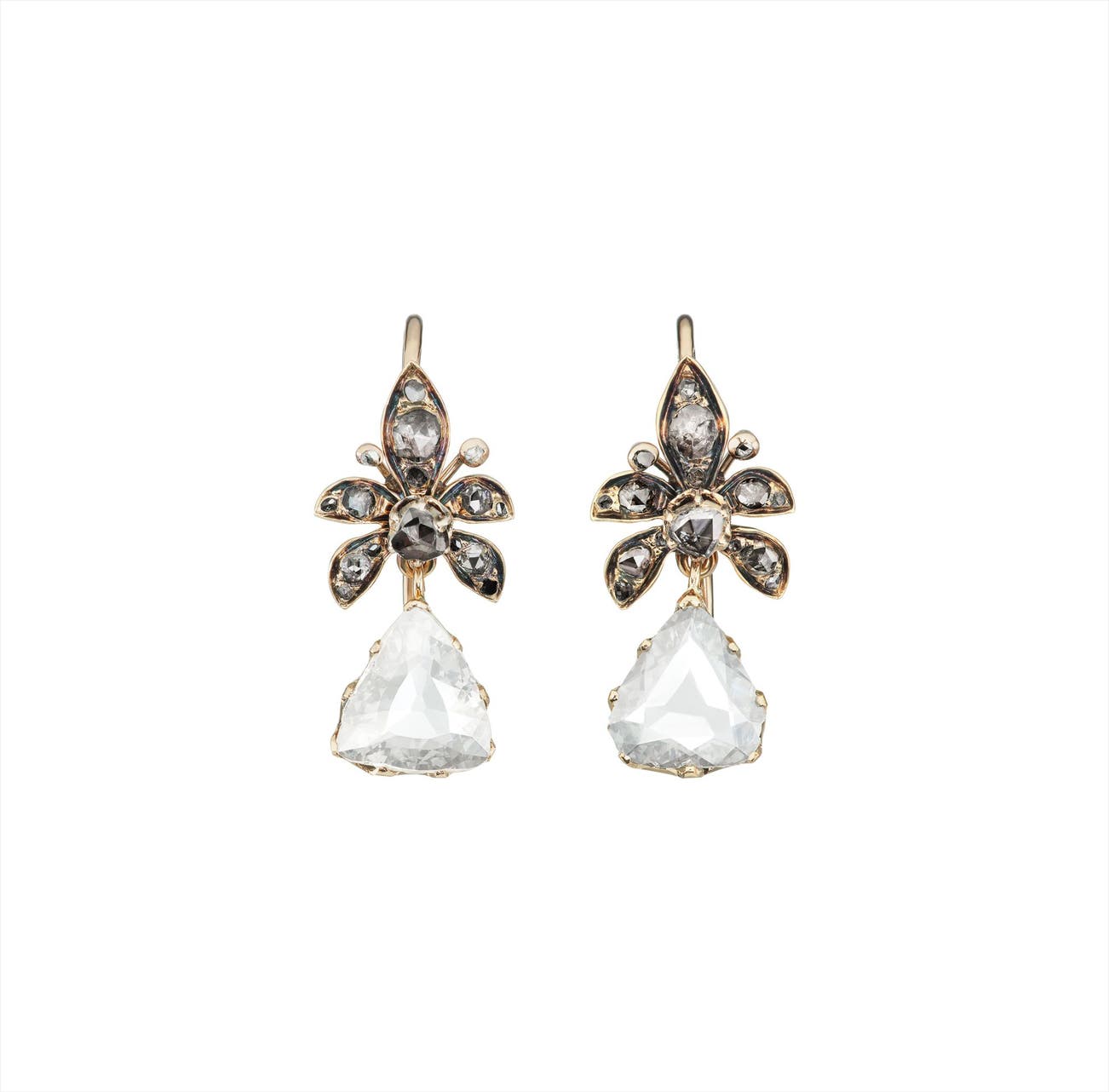 Each suspending a rose-cut diamond drop from a foliate surmount accented by rose-cut diamonds, mounted in 18K yellow gold and blackened gold, length 1 1/4 inches.
