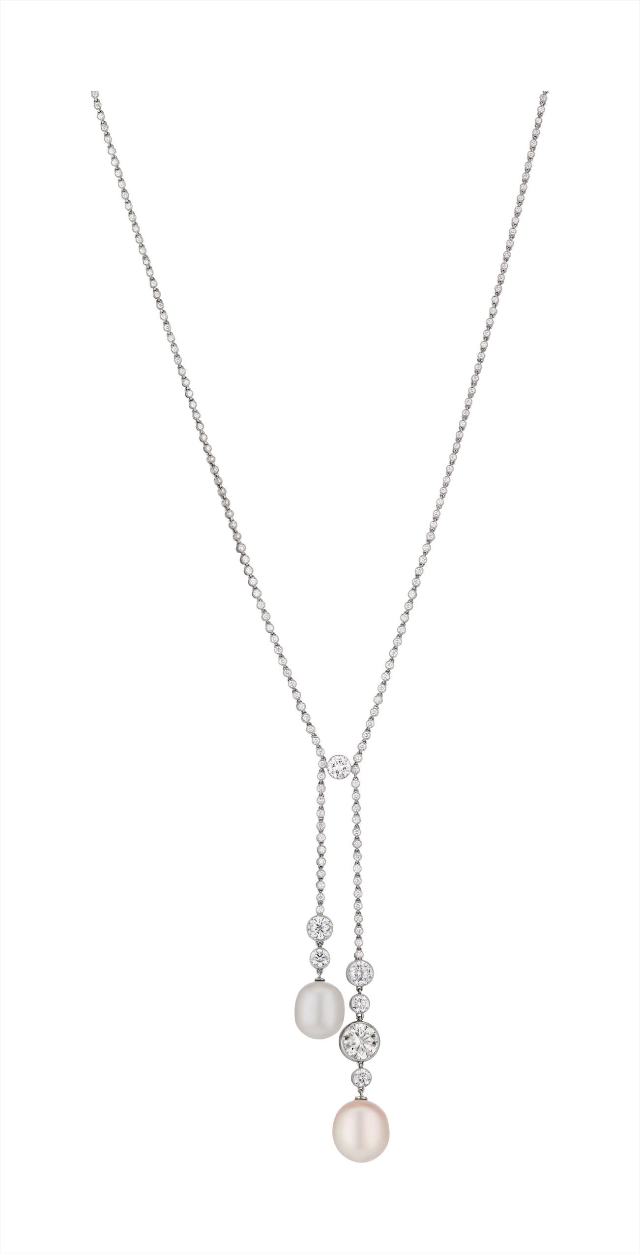 Designed as a line of collet-set diamonds, joined to the front by a circular-cut diamond, suspending similarly designed fringes set with natural pearl terminals measuring approximately 11.00 to 12.30 mm, mounted in platinum, chain length 14 1/2 inches, drop length 2 1/4 to 3 1/4 inches.