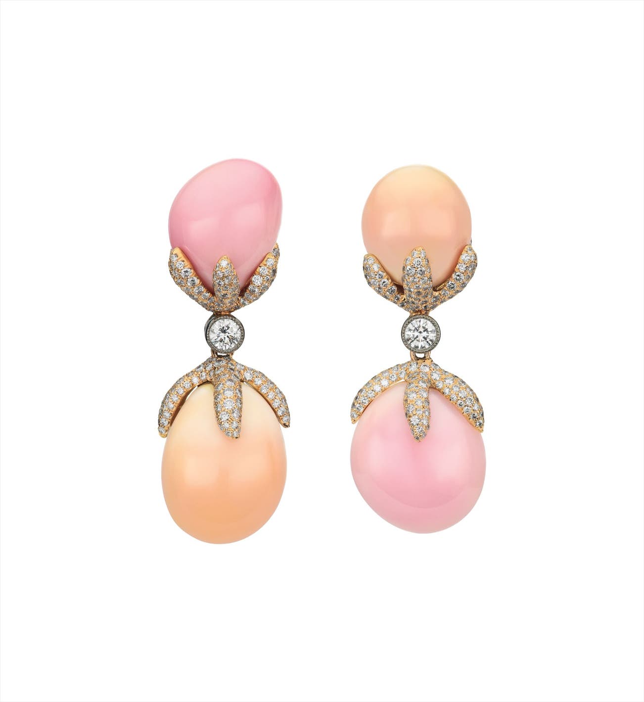 Each alternately suspending a pink or orange conch pearl from a foliate pavé-set diamond cap, to the circular-cut diamond spacer link and similarly designed surmount, mounted in 18K yellow gold and platinum, length 2 inches.
