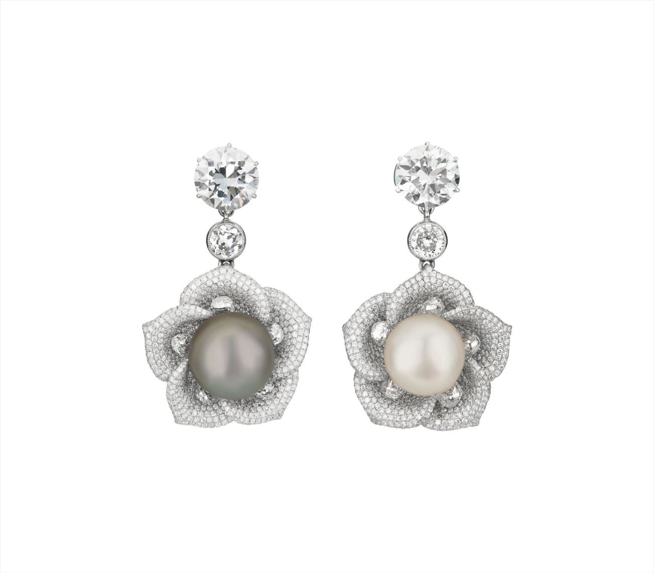 Each designed as a circular-cut diamond surmount weighing approximately 5.55 carats in total, suspending a collet-set diamond spacer link and pavé-set diamond flower, the petals accented by briolette diamonds, centering upon a natural South Sea or Tahitian pearl, mounted in platinum, length 1 1/2 inches.