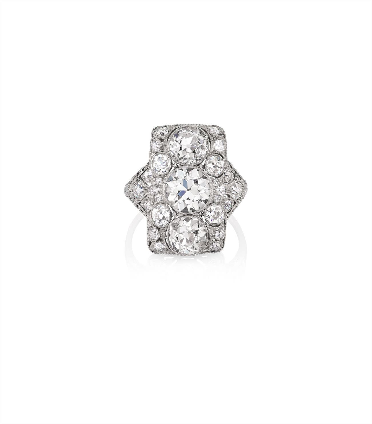 Designed as a row of three old-cut diamonds, the largest weighing approximately 1.66 carats, set within a pierced open-work plaque enhanced by old-cut diamonds, mounted in platinum, size 7 1/2.