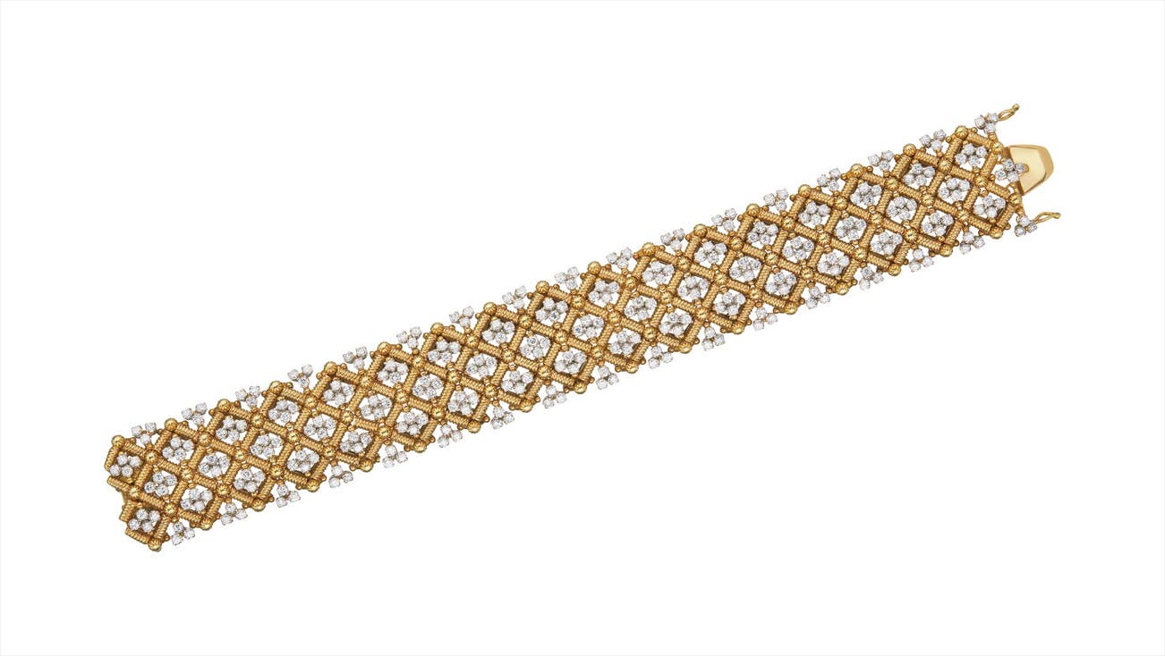 Designed as a textured gold lattice work band, enhanced throughout by circular-cut diamonds, mounted in 18K yellow gold, length 7 1/4 inches.