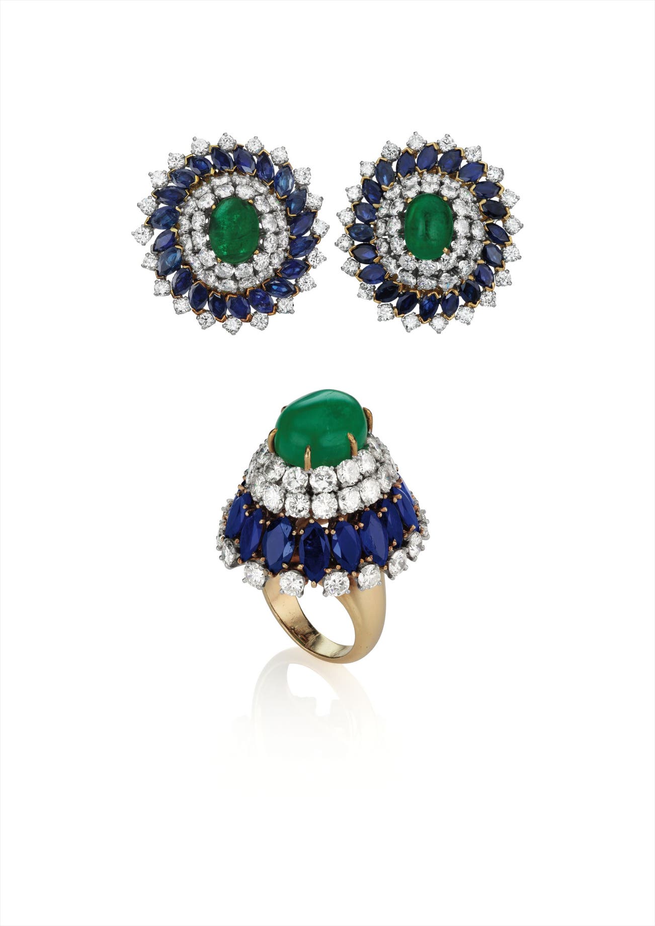 Comprising a ring centering upon an oval cabochon emerald, to the alternating surround set with circular-cut diamonds and marquise-cut sapphires; a pair of earclips en suite, mounted in 18K yellow gold, earclip length 1 1/4 inches, ring size 5 3/4.