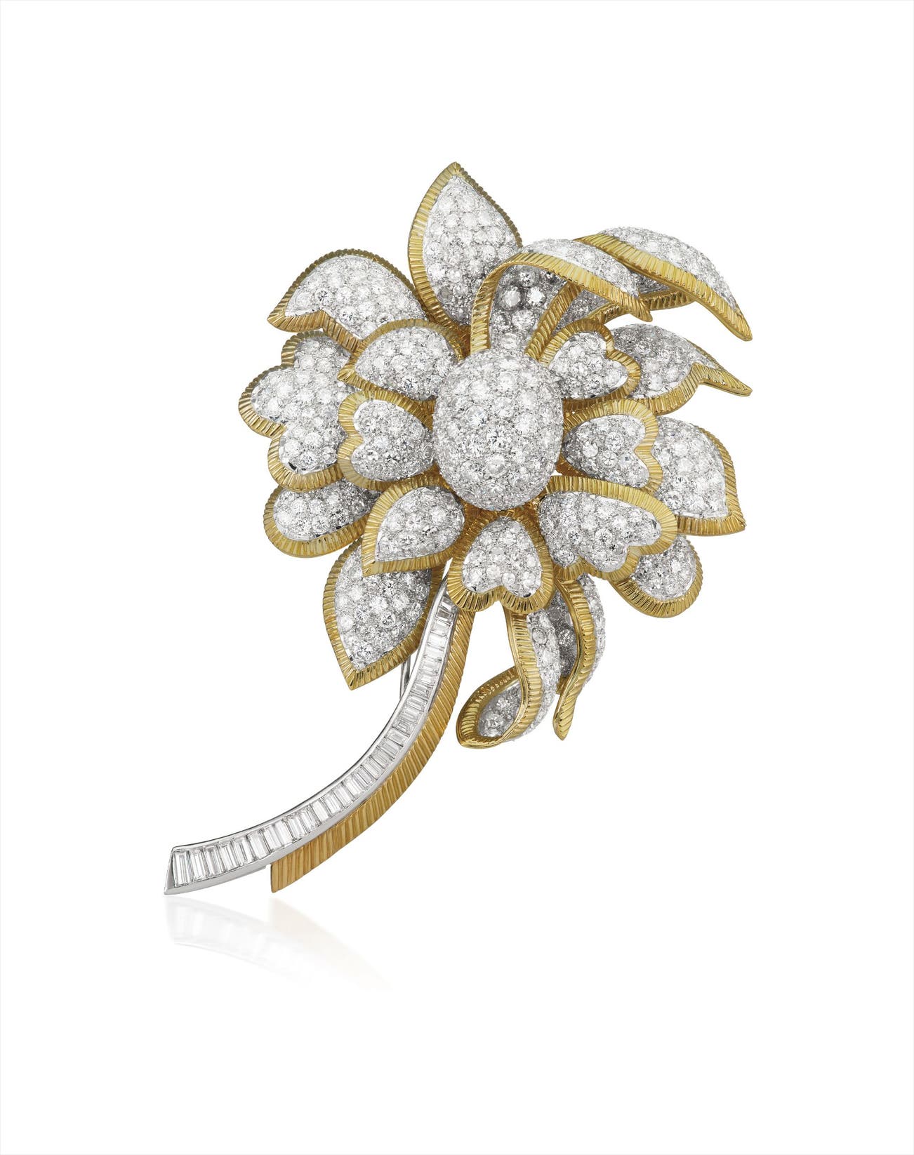 Designed as a polished gold flower, the articulated petals entirely set with circular-cut diamonds, to the stem enhanced by baguette-cut diamonds, mounted in 18K yellow gold and platinum, length 3 1/2 inches.