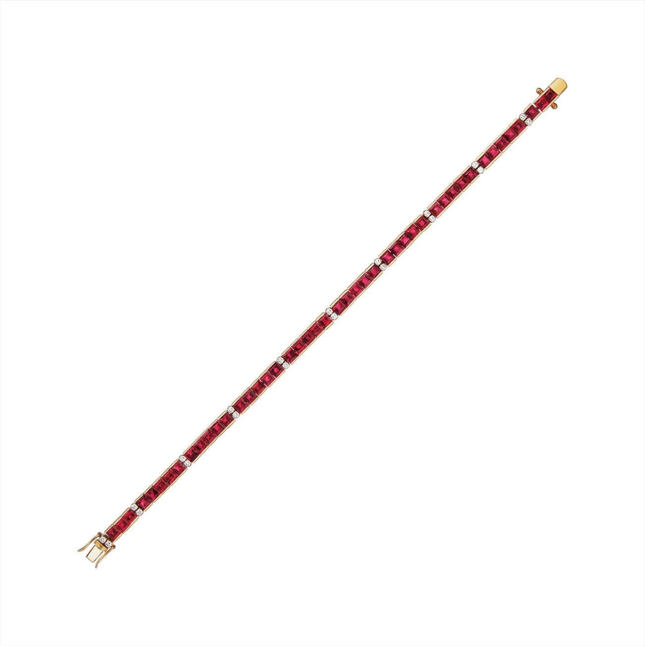 Designed as a line of square-cut rubies, interspersed by circular-cut diamonds, mounted in 18K yellow gold, length 6 1/2 inches.