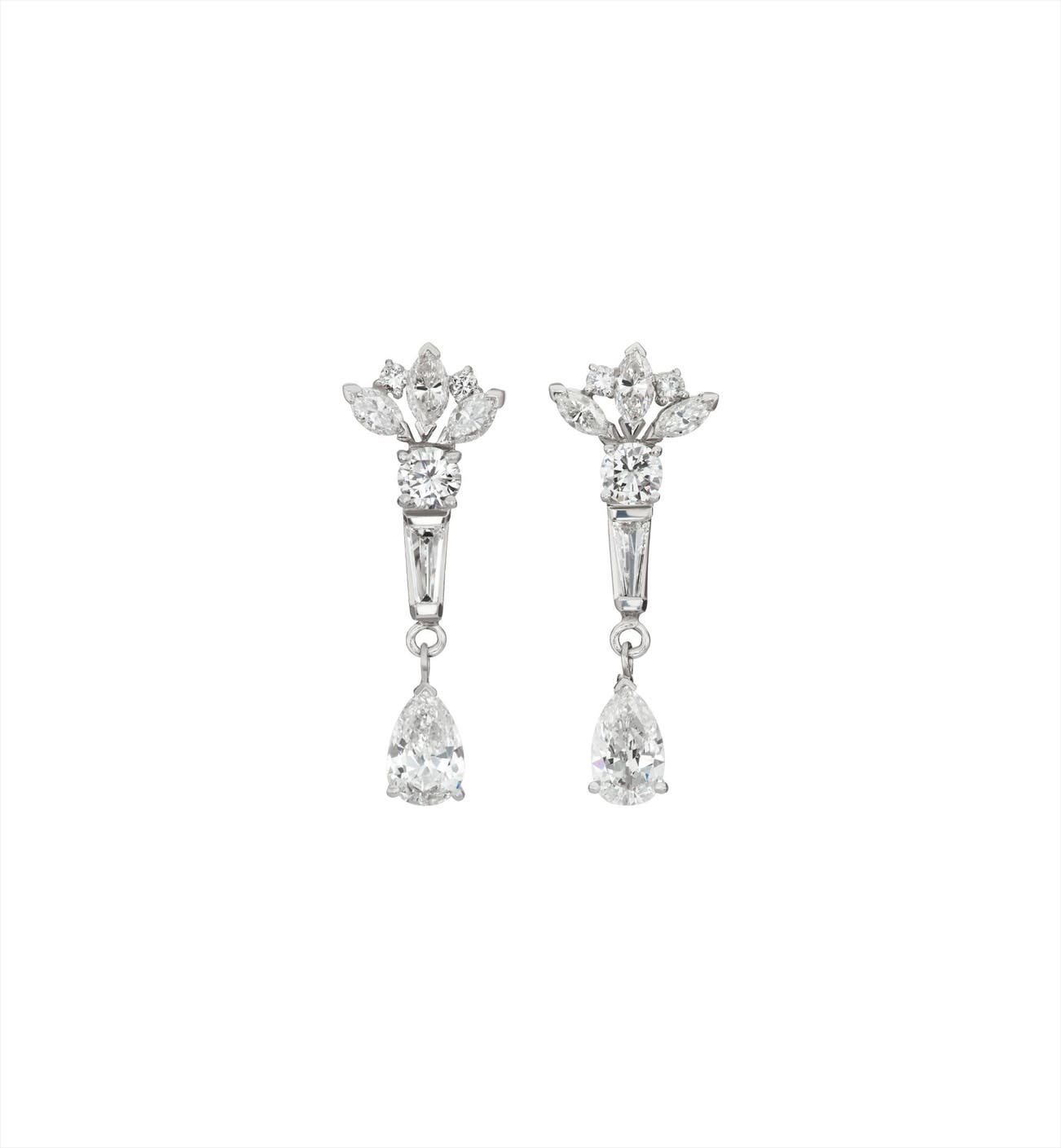 Each designed as a line of vari-cut diamonds suspending a pear-shape diamond, mounted in 18K white gold, length 1 inch.