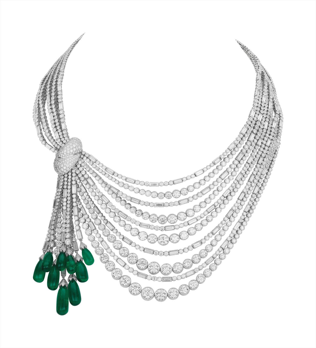 Of asymmetric design, the cascade of circular and rectangular-cut diamond swags weighing approximately 83.45 carats in total, joined at the side by a pavé-set diamond accent, extending a tassel of vari-cut diamond fringes, terminating in Colombian emerald drops weighing approximately 47.11 carats in total, mounted in platinum, length 16 3/4 inches to 20 inches.