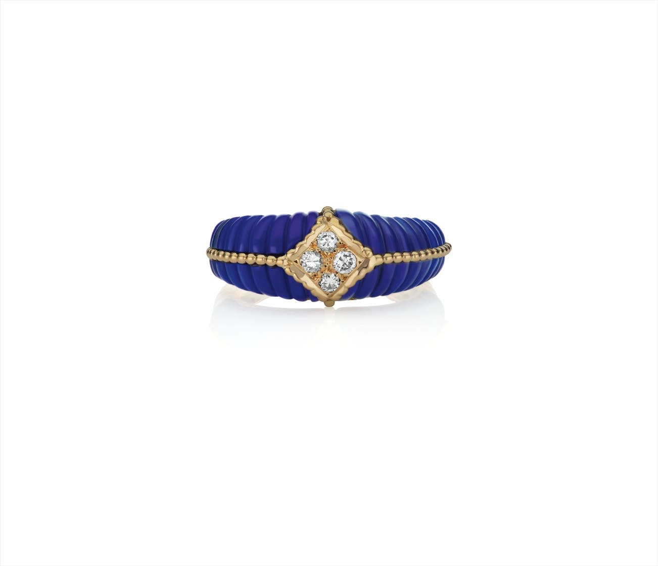 Of bombé design, set to the top with carved lapis lazuli, enhanced by gold rope-twist accents and circular-cut diamonds, to the polished gold beveled hoop, mounted in 18K yellow gold, size 7 1/2.