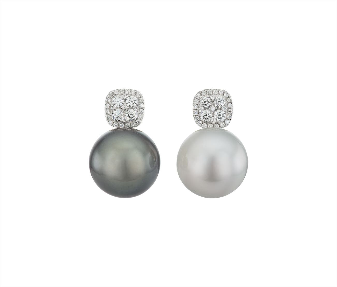 Each square surmount designed as a cluster of circular-cut diamonds, suspending a South Sea or Tahitian cultured pearl measuring approximately 16.00 mm, mounted 18K white gold, length 1 inch.