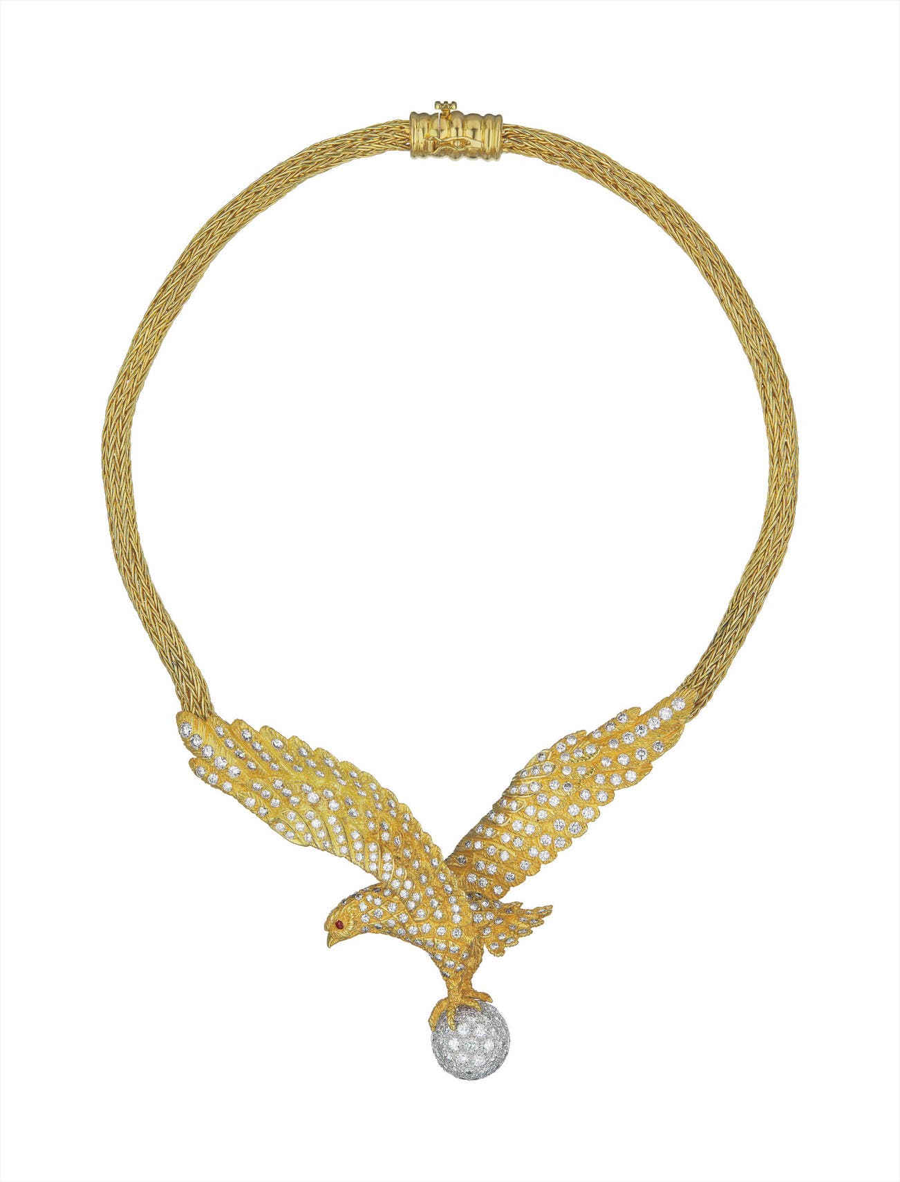The front designed as a textured gold bird entirely set with circular-cut diamonds, accented by cabochon ruby eyes, grasping a pavé-set diamond sphere, to the woven gold back chain, mounted in 18K yellow gold, length 17 1/2 inches.