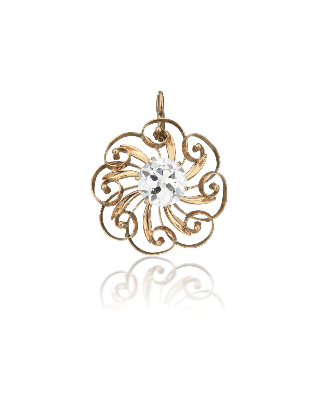 Designed as a scrolling, open-work plaque, centrally set with a circular-cut diamond weighing approximately 3.16 carats, mounted in 14K yellow gold, length 1 inch.