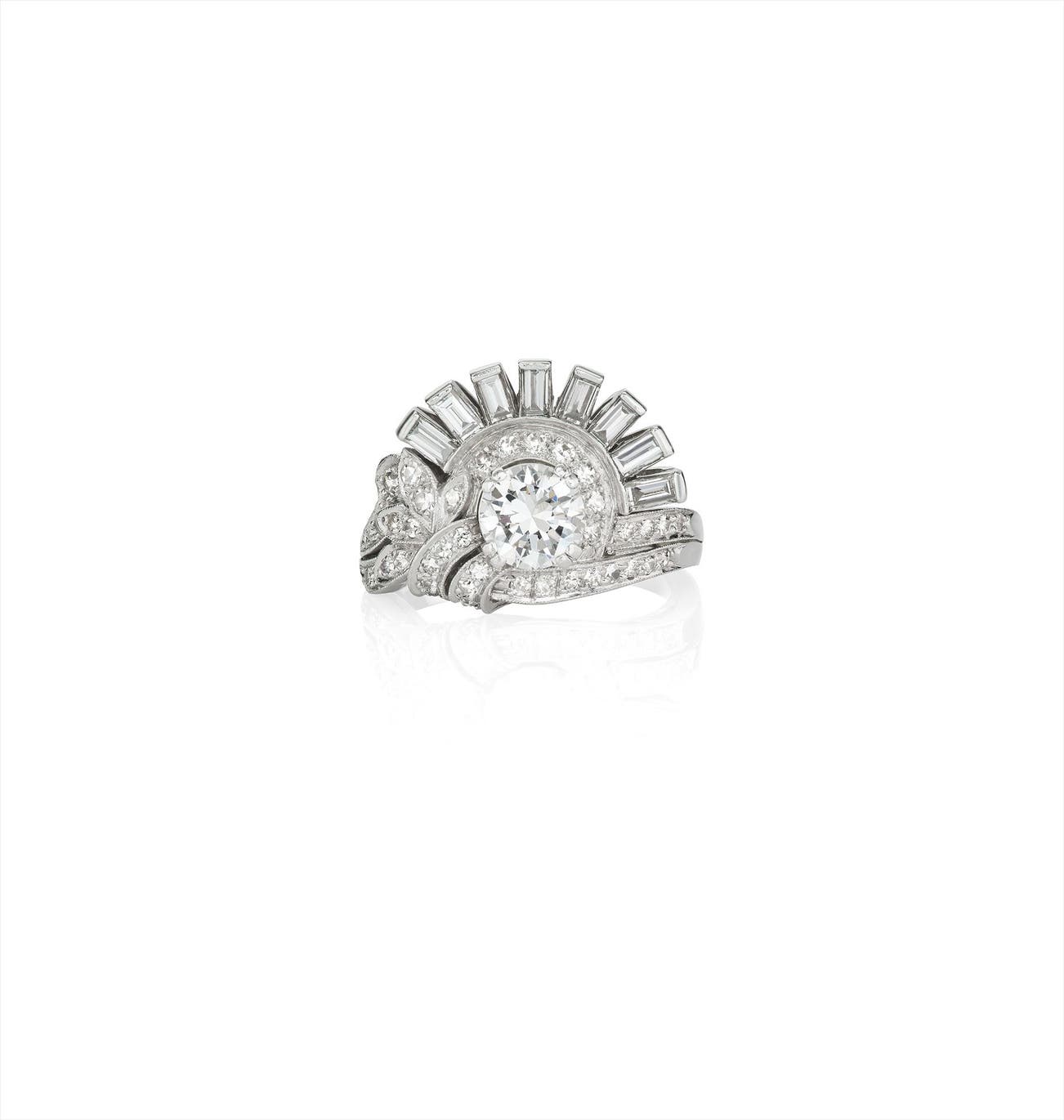 Designed as a stylized knotted ribbon set with circular-cut diamonds, centering upon a larger circular-cut diamond, framed by baguette-cut diamonds, mounted in platinum, size 4 1/2.