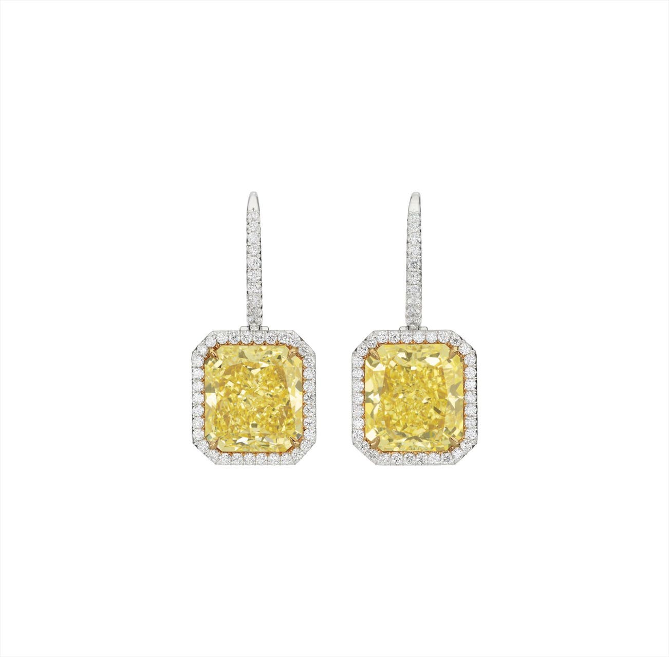 Each suspending a rectangular-cut Fancy Yellow diamond, weighing approximately 6.33 and 6.39 carats, set within a circular-cut diamond surround, from a circular-cut diamond line, mounted in platinum and 18K yellow gold, length 1 1/4 inches.