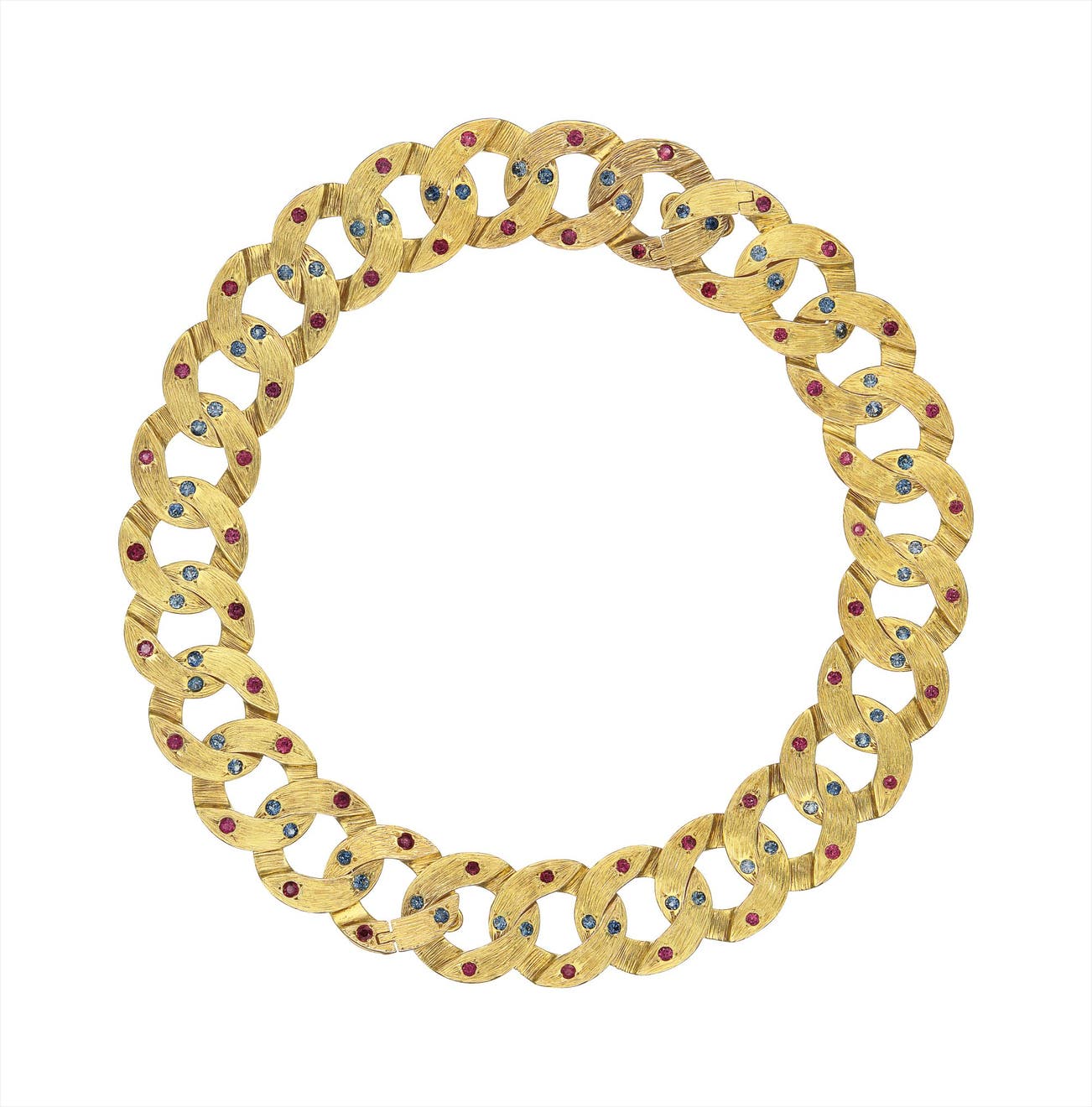 Designed as a line of textured gold links enhanced by circular-cut sapphires and rubies, mounted in 14K yellow gold, length 15 3/4 inches, can be worn as two bracelets.