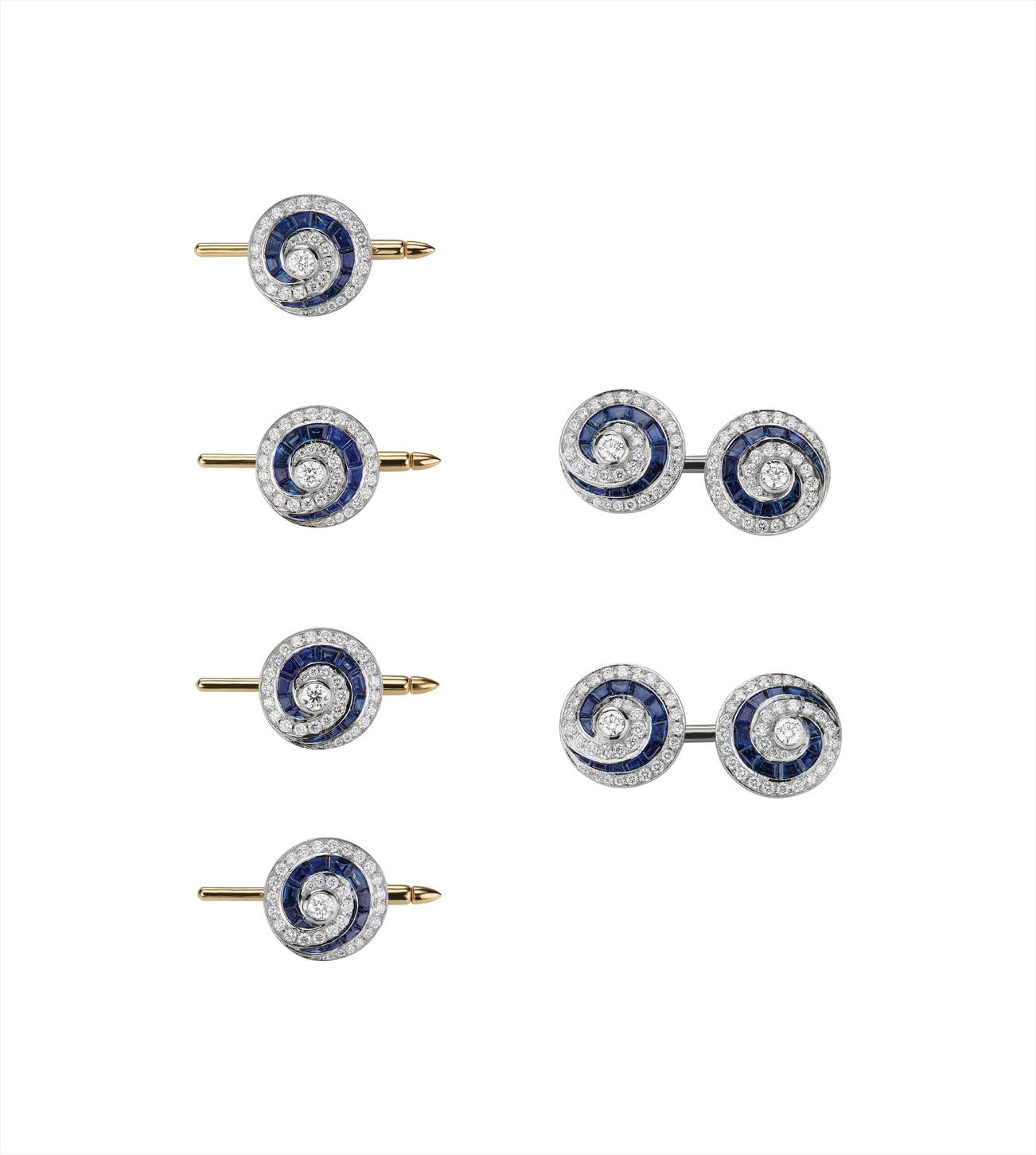 Comprising a pair of cufflinks each designed as a circular plaque, enhanced by a swirl motif of circular-cut diamonds and calibré-cut sapphires, to the similarly design link; four shirt studs en suite, mounted in 18K white and yellow gold, cufflink length 1/2 inch, shirt stud length 1/2 inch.