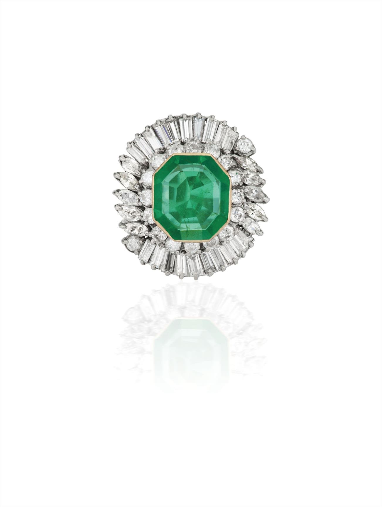 Centering upon an octagonal-cut emerald set within a circular-cut diamond surround, extending to a vari-cut diamond border, mounted in 14K white and yellow gold, size 7 1/2.