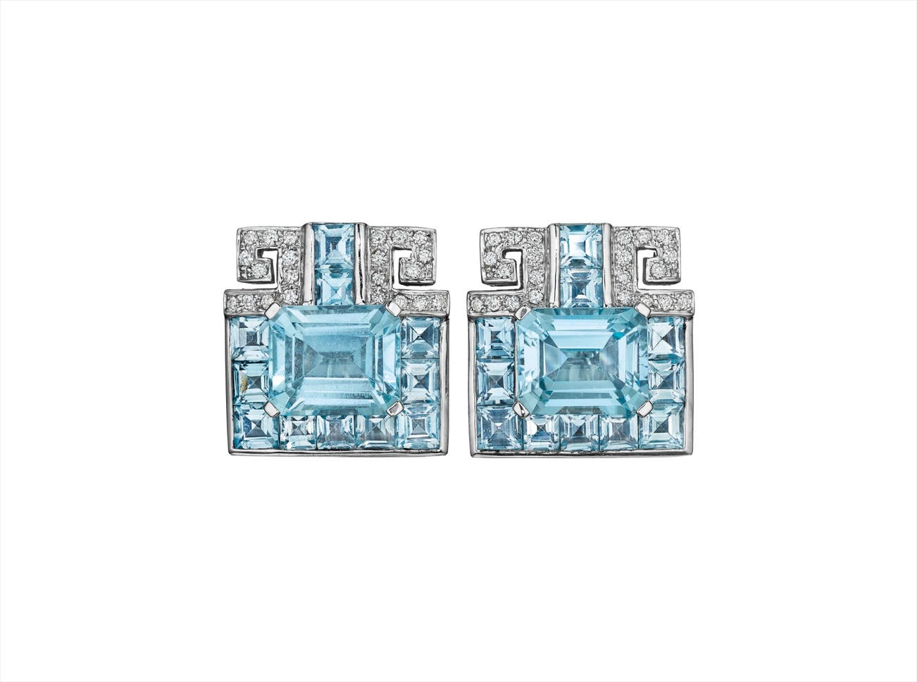 Designed as a square plaque centering upon a rectangular-cut blue topaz, to the square-cut blue topaz border and the geometric pavé-set diamond accents, mounted in 18K white gold, length 7/8 inch.