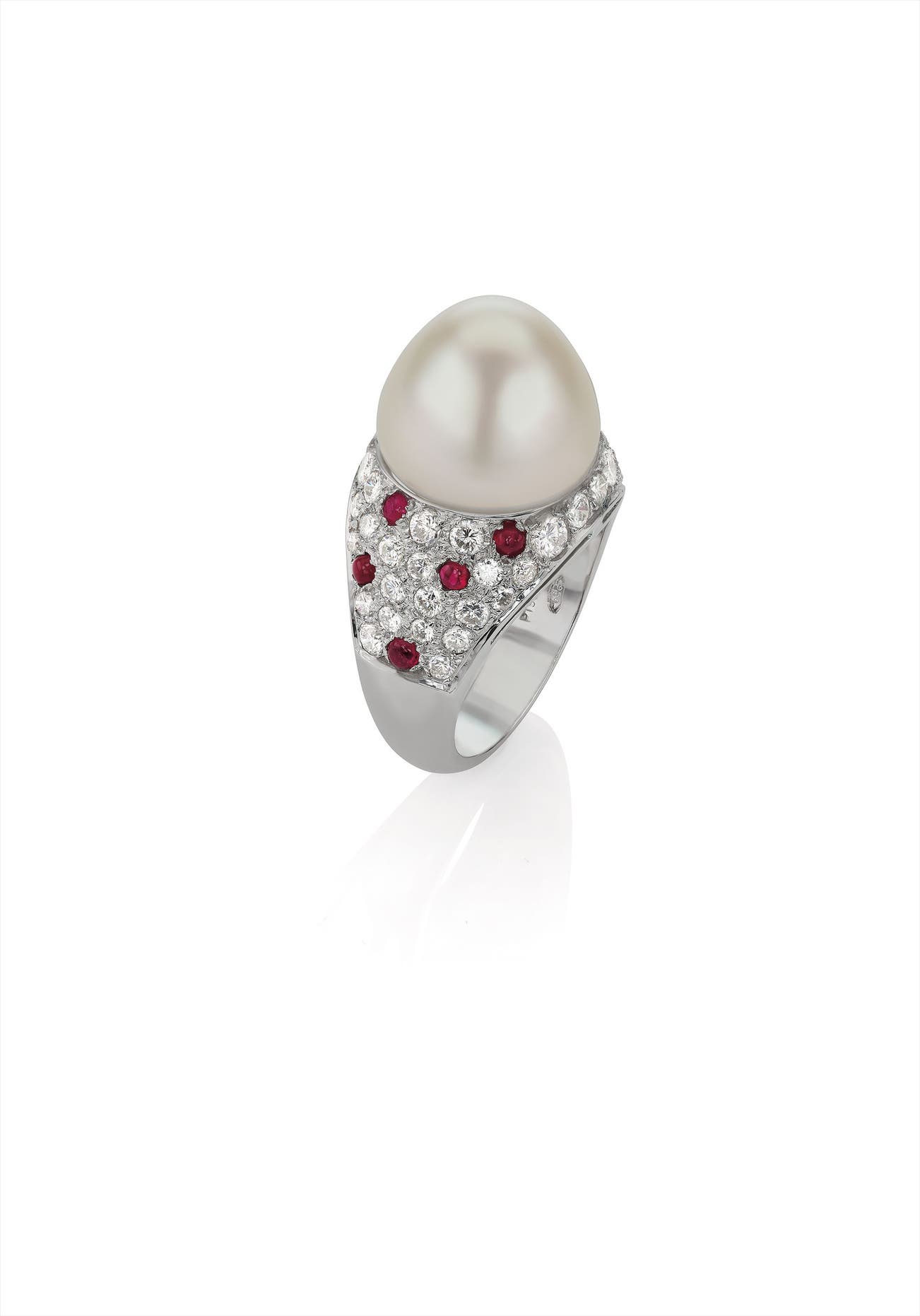 Of bombé design, centering upon a cultured pearl measuring approximately 13.00 mm, to the pavé-set diamond gallery and shoulders enhanced by cabochon rubies mounted in platinum, size 6.