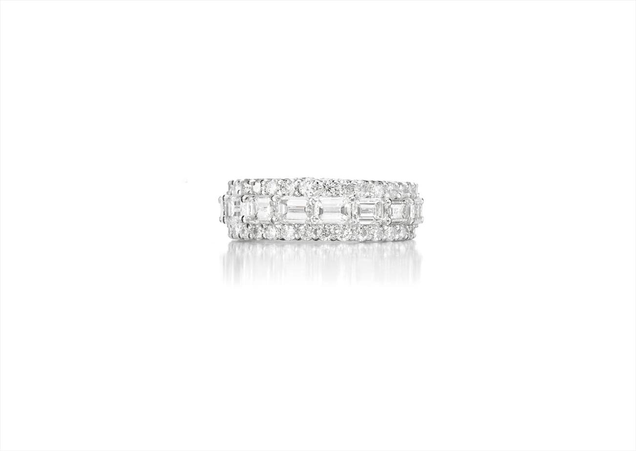 Designed as a wide eternity band, centrally set with sixteen rectangular-cut diamonds framed by a circular-cut diamond border, weighing approximately 6.11 carats in total, mounted in platinum, size 6.