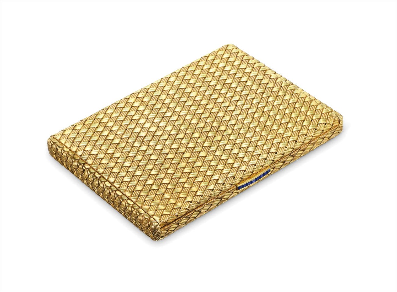 Of basket weave design, the textured gold case enhanced by a channel-set square-cut sapphire clasp, mounted in 18K yellow and rose gold, length 4 1/4 inches, width 3 inches, depth 3/8 inch.