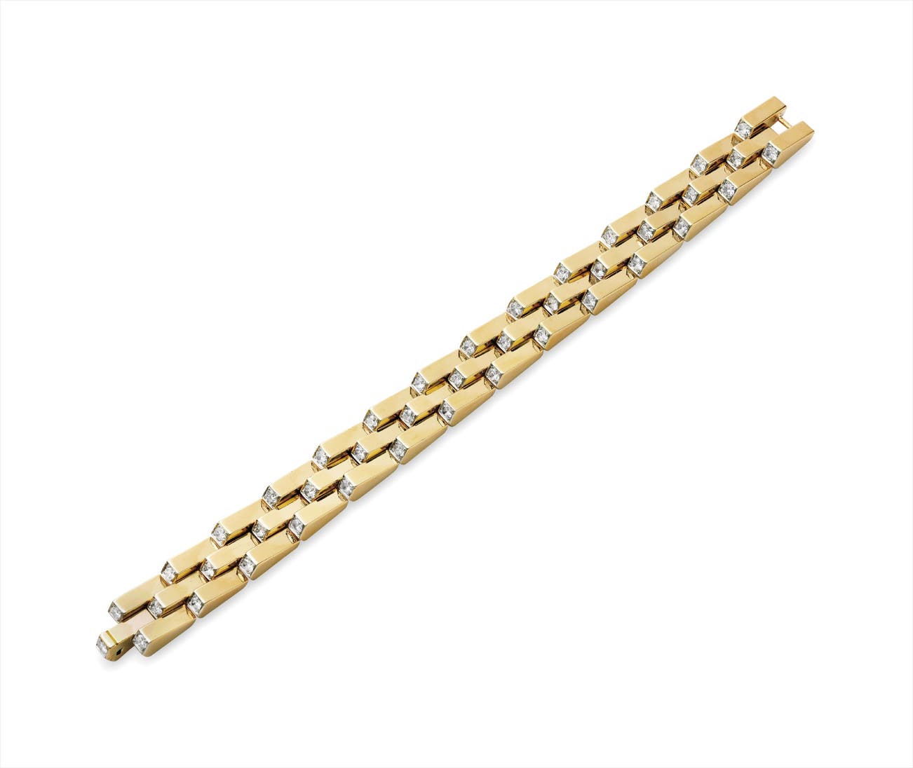 Designed as a series of rectangular polished gold links, each enhanced by a circular-cut diamond, mounted in 18K yellow gold, length 7 1/4 inches.